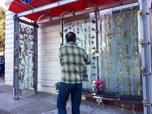 The aim of the Bus Stop Bloom project was to use wild-growing flowers, universal symbols of beauty, to create accessibility and appreciation for natural elements in an otherwise urban yet intimate space. I chose the bus stop at Geary Ave and 25th St, a busy transfer stop that I spend a lot of time at. After scouting and gathering plants from public spaces across the city (plants native to SF but not indigenous or endangered) I worked to arrange and install the flowers with the help of a fellow artist and friend Kimmy Haines. After 14 hours of work we finished installing at 8am, a Tuesday. We hung out for a few hours, watching people stop to look at the flowers, and talking with bus-riders. Some people said “it made their day” and thanked me for the gift. Some didn’t say anything, but stopped for a few seconds to take a photo. One bus driver stuck her head out the window to yell excitedly at me and Kimmy: “You made that?? I LOVE it!!” Two elderly men struck up a conversation about the current design of Muni bus stops, which launched into a conversation about the “good old days” in SF. Would that conversation had taken place if not for the flowers? I’m not sure. It felt good.